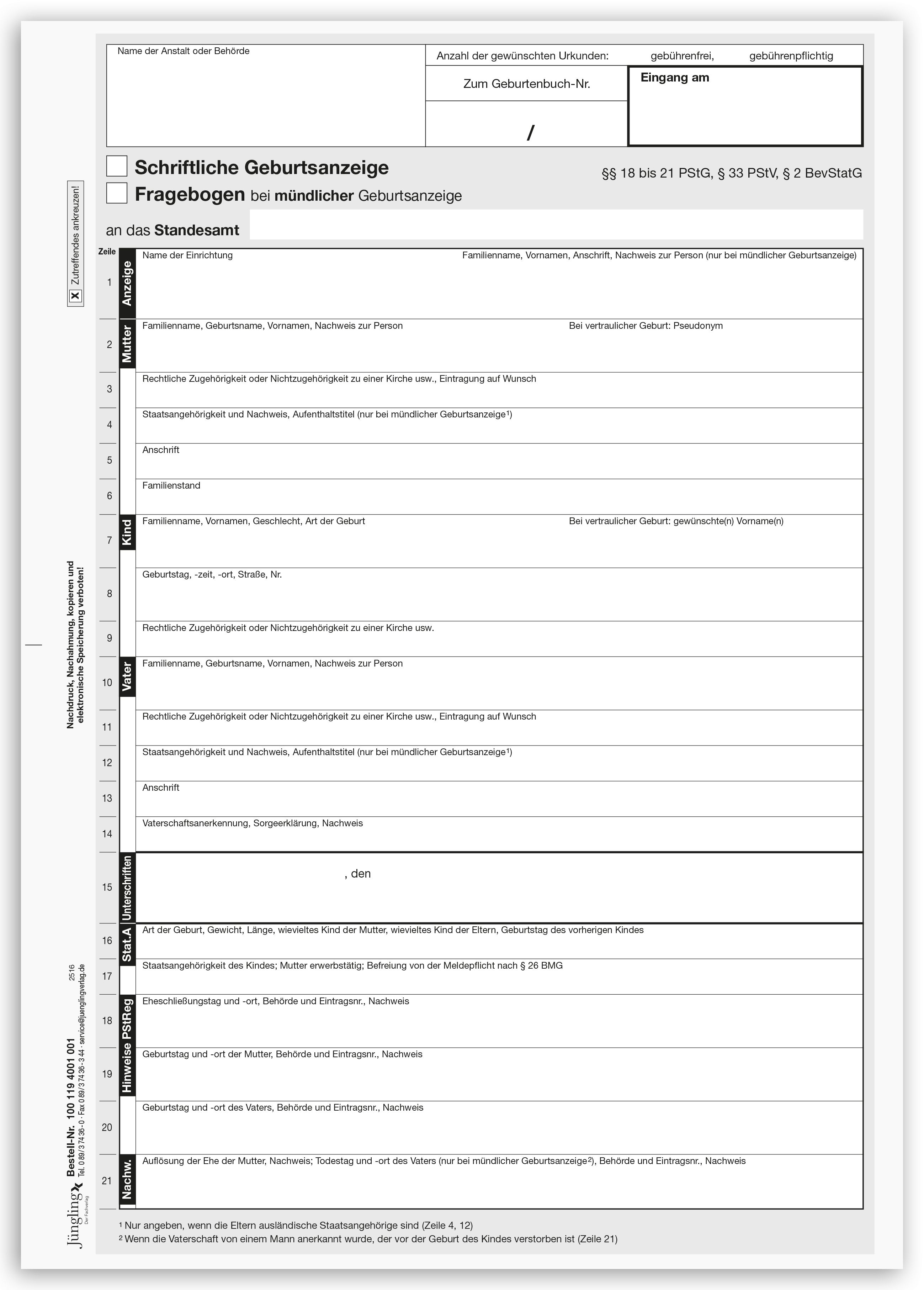 Schriftliche Geburtsanzeige gemäß PStG mit Namenserklärung, A4