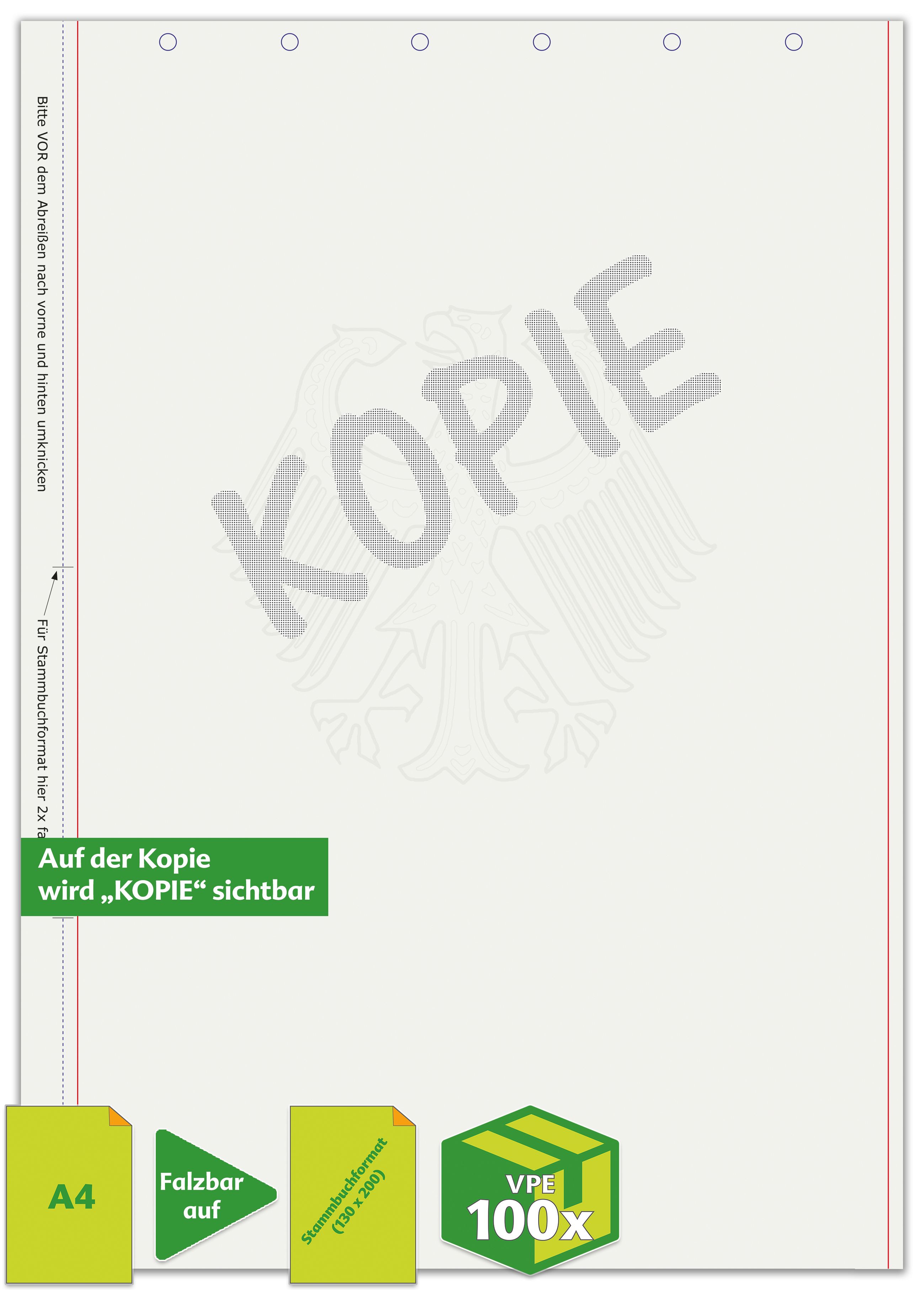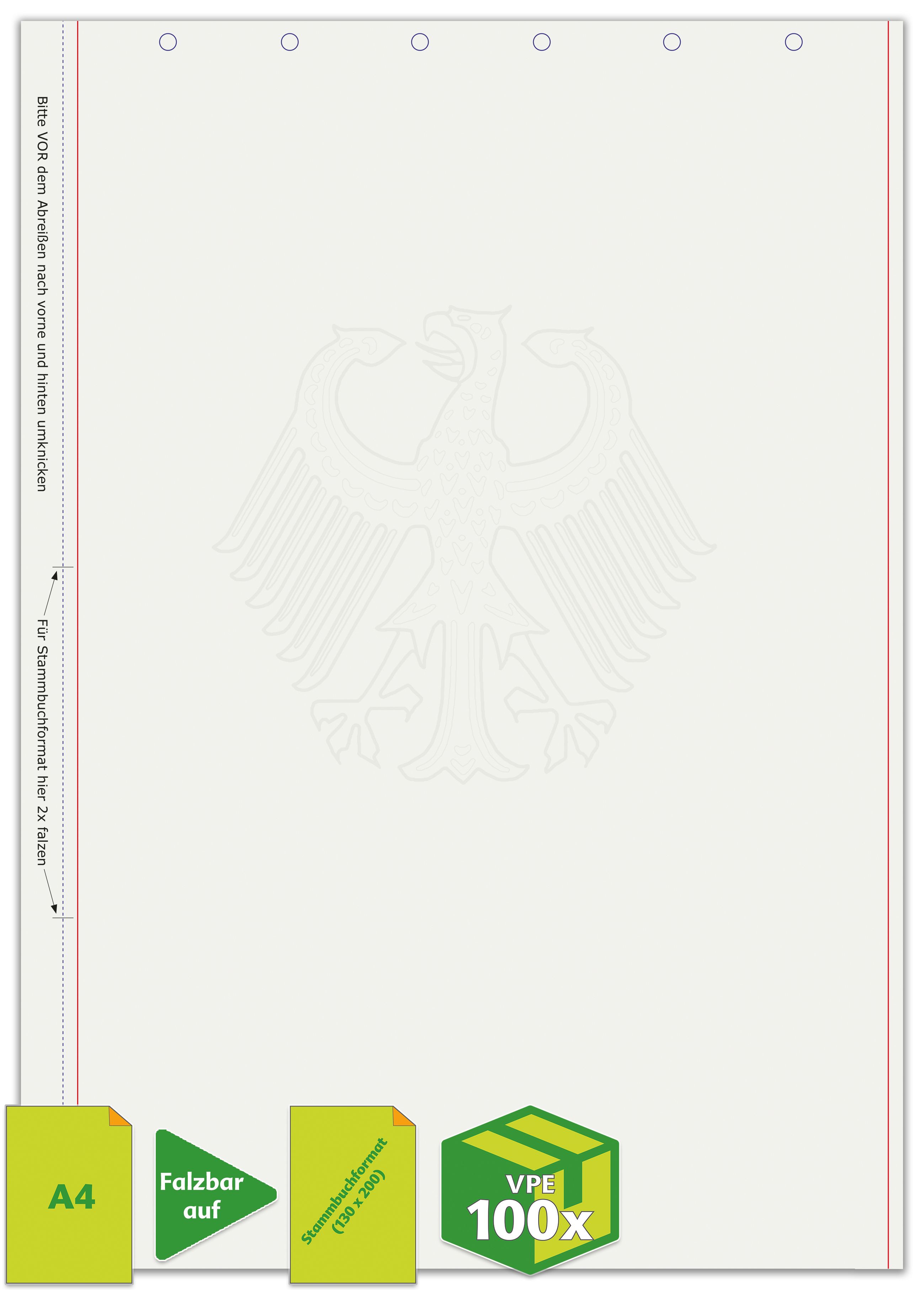 Das Sicherheitspapier im DIN A4 Format ist speziell zum Falzen auf das Stammbuchformat konzipiert. Es verfügt über einen ansprechenden Schmuckrand und das Sicherheitselement Adler, kopiererschwerend. Das Papier hat ein Gewicht von 100g und ist mit Perforation sowie einer 6-Ring-Lochung versehen. Es entspricht der Norm DIN 19307 und wird in Verpackungseinheiten von je 100 Stück geliefert.