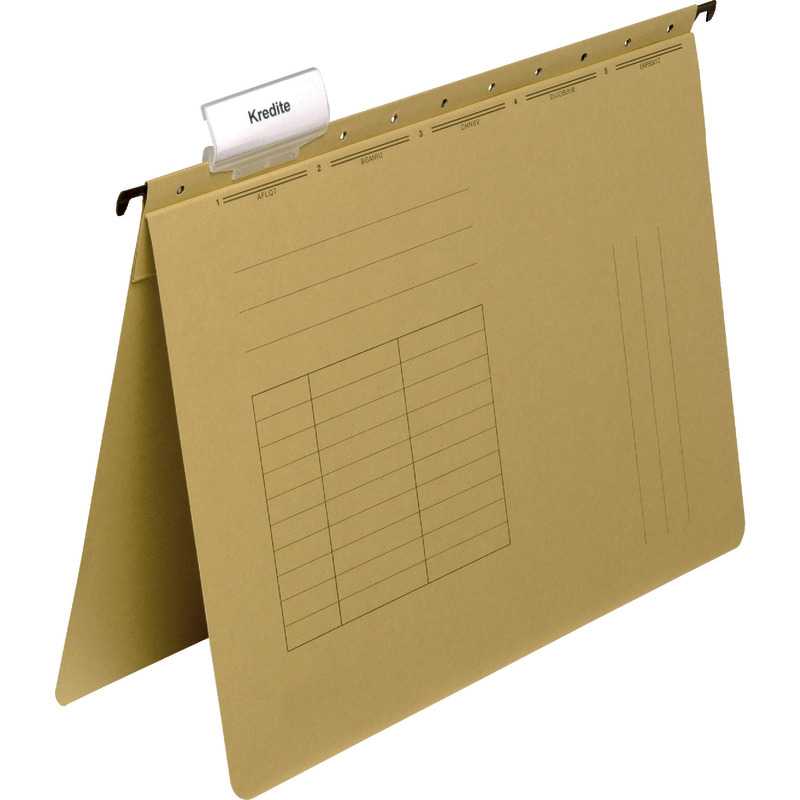 - Fix und fertig ausgestattet mit Hängeschienen aus Metall und kunststoffummantelten Enden, Abheftvorrichtung, Reiter und Beschriftungsschildchen