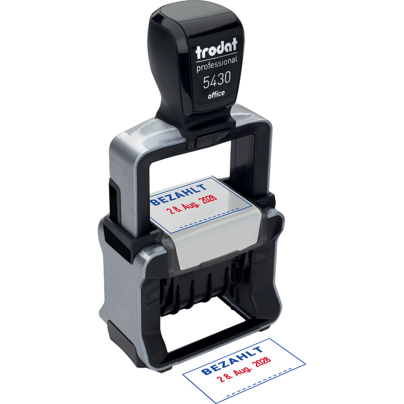 Der neue Trodat Professional 4.0 5430 ist ein Metallstempel aus Edelstahl mit eingebautem Trodatkissen® für den täglichen Einsatz im Büro. Der Stempel hat ein Textplatten-Maß von 41 x 24 mm, sowie ein mittiges Datum mit einer Schrifthöhe von 4 mm und ist für einen Text mit max. 2 Zeilen geeignet (jeweils drei Zeilen über und drei unter dem Datum). Das Datum ist in deutsch, z.B. 28. Aug. 2026.