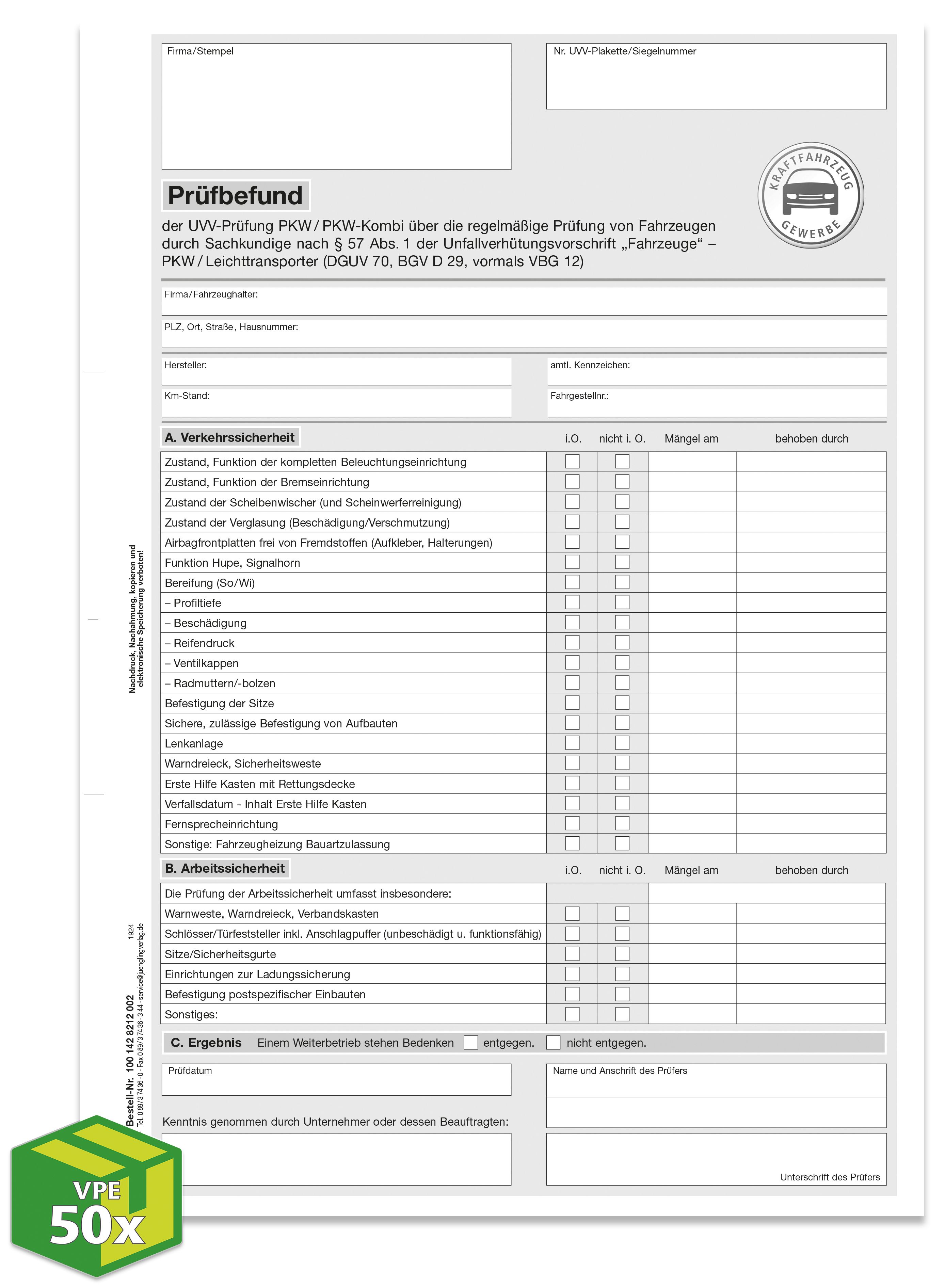 UVV-Prüfung Kfz Prüfbefund/Prüfprotokoll (mit Logo Kfz-Innung), VKE 50 Satz
