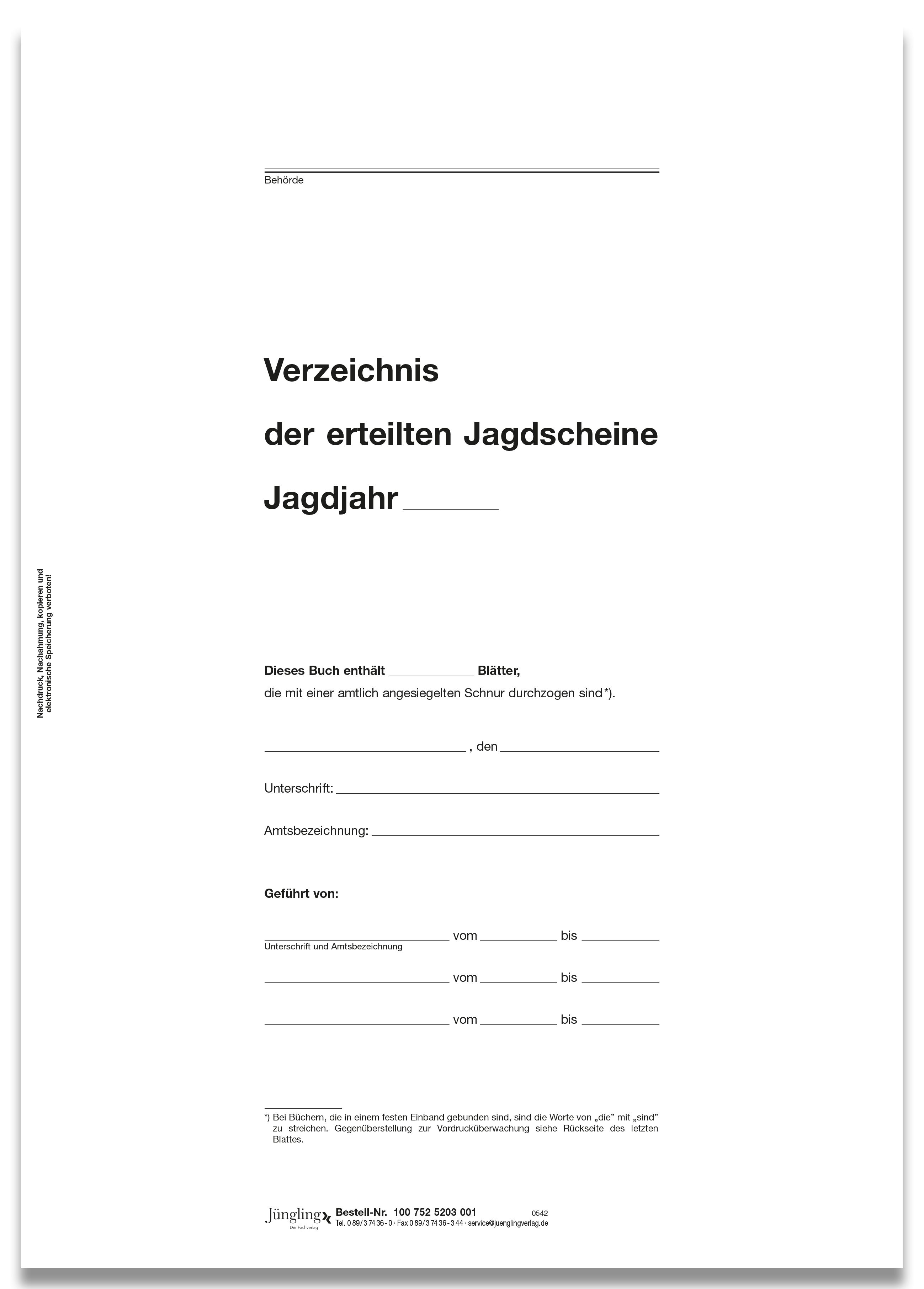 Produktinformationen "Verzeichnis der erteilten Jagdscheine - Titelbogen"