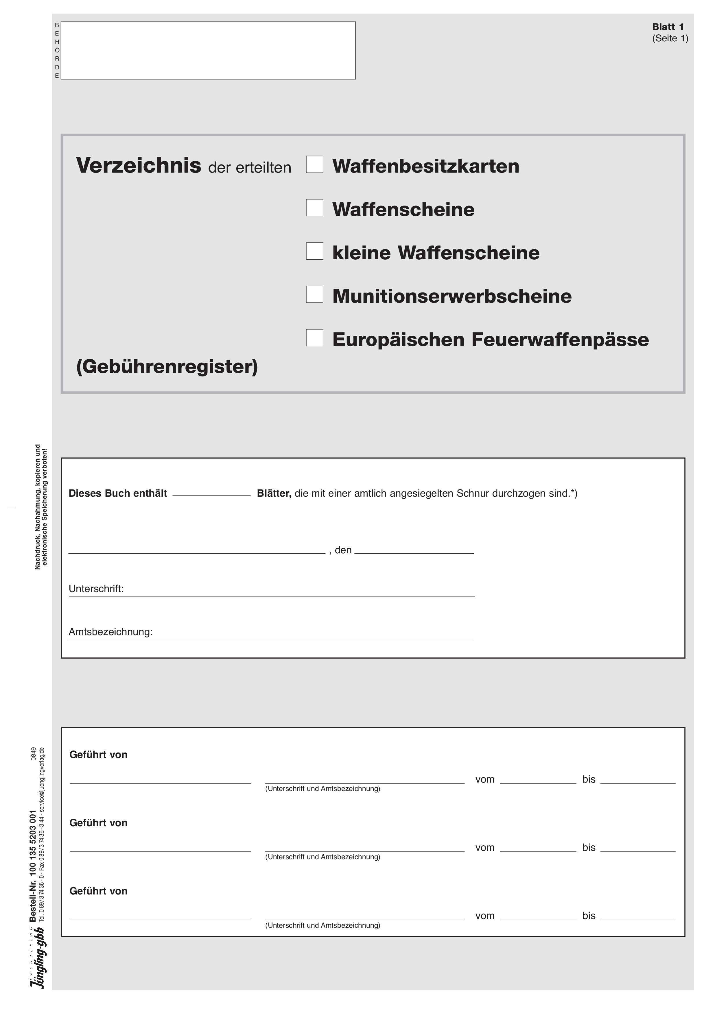 Produktinformationen "Verzeichnis waffenrechtlicher Erlaubnisse - Titelbogen, DIN A4, 4-seitig"