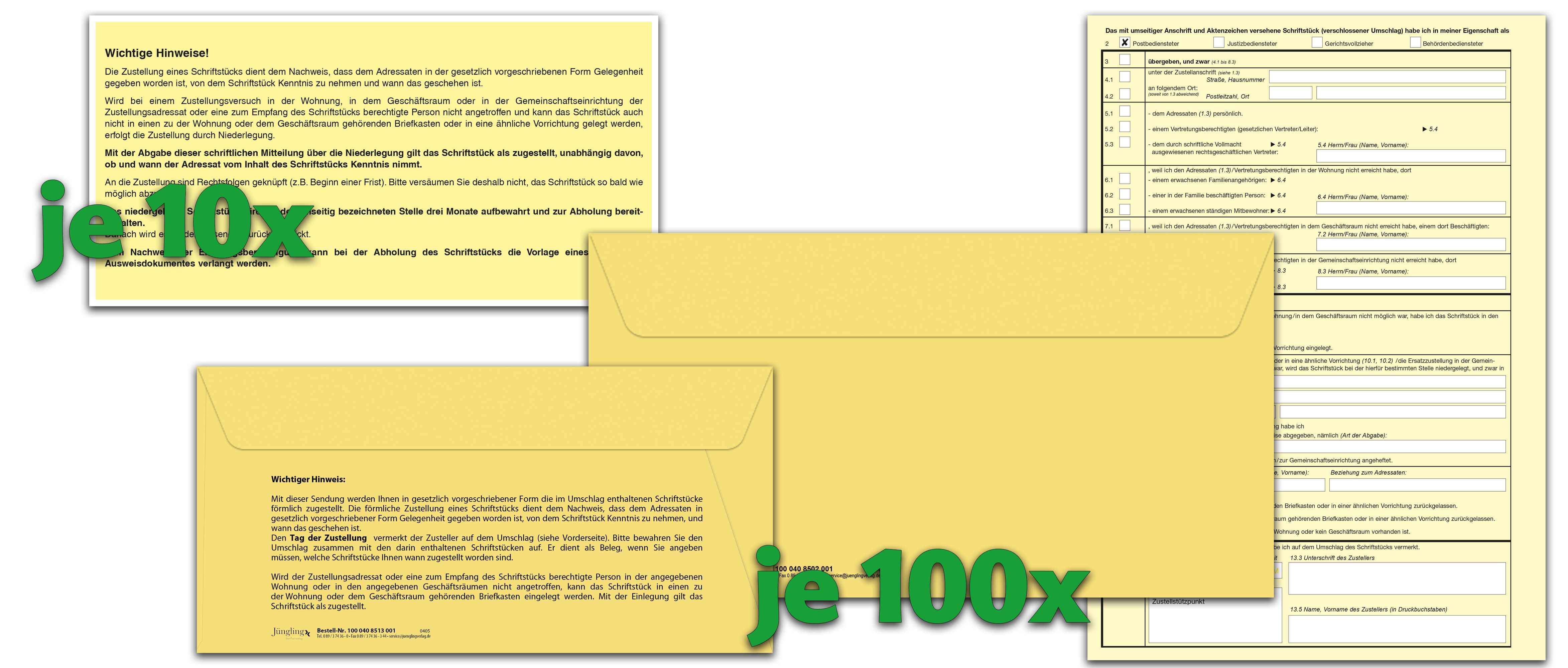 Das ZU-Paket enthält alle notwendigen Bestandteile für förmliche Zustellungen über die Deutsche Post AG. Es umfasst 100 Zustellungsurkunden, passende innere und äußere Umschläge sowie Benachrichtigungen über Niederlegungen. Ideal für den Einsatz in Behörden und Unternehmen.