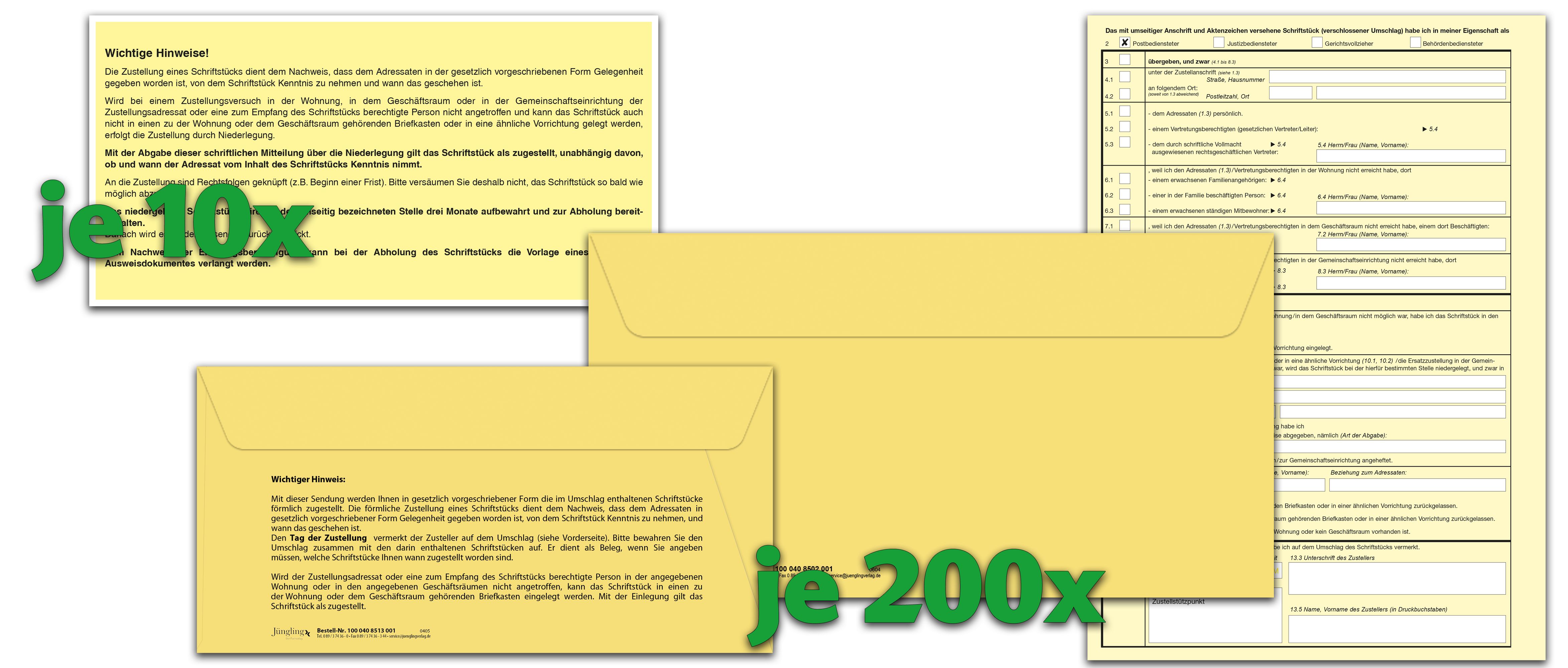 Das ZU-Paket enthält alle wesentlichen Bestandteile für förmliche Zustellungen, inklusive Zustellungsurkunden und Umschläge mit dem Eindruck 'Deutsche Post AG'.