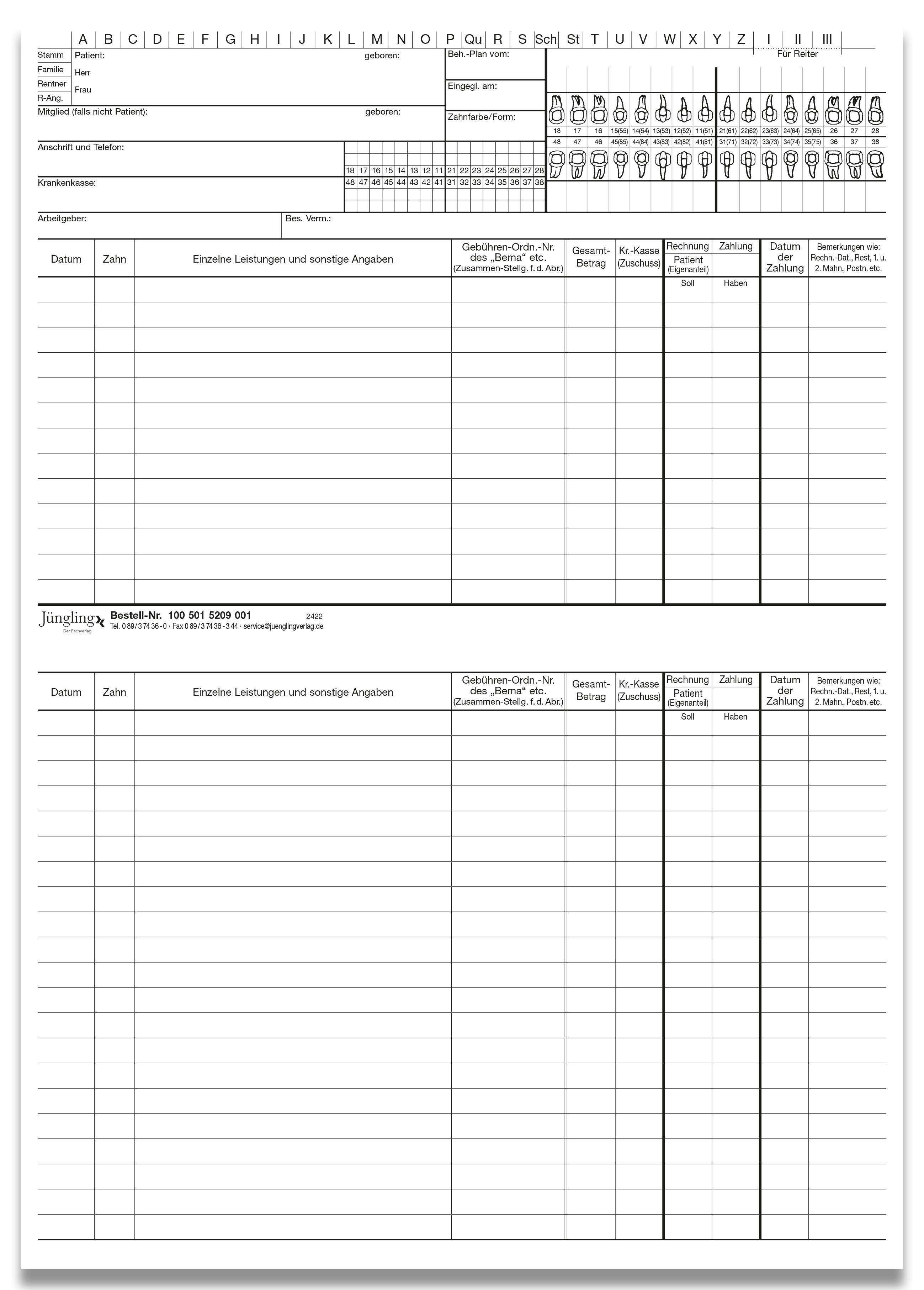 Diese Universalkartei richtet sich speziell an Zahnarztpraxen, die Wert auf eine klare und effiziente Dokumentation der Patientenakten legen. Durch das praktische Format und die durchdachte Gestaltung ist sie die perfekte Unterstützung für eine reibungslose Praxisverwaltung.