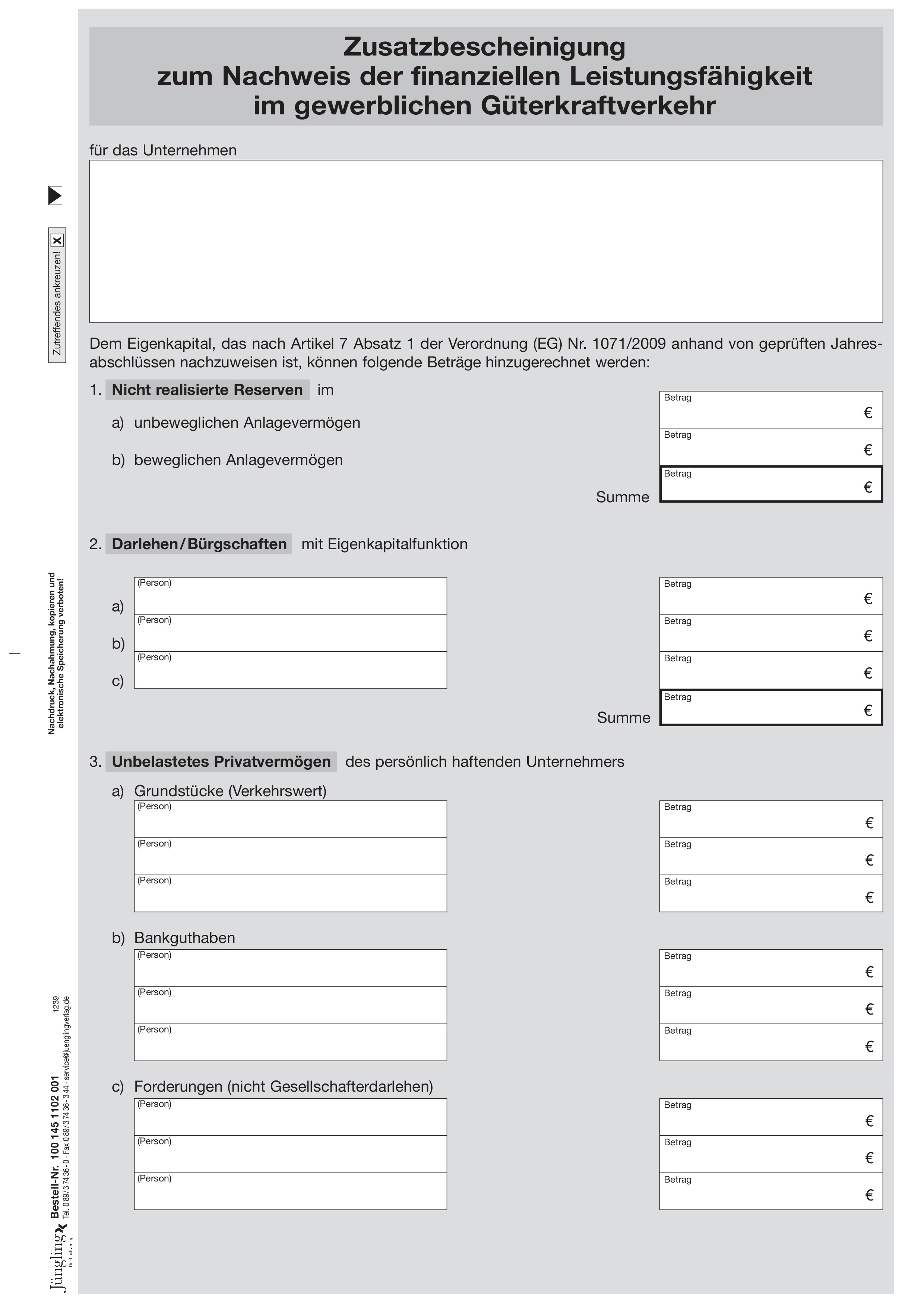 Zusatzbescheinigung zum Nachweis der finanziellen Leistungsfähigkeit im gewerblichen Güterkraftverkehr, A4