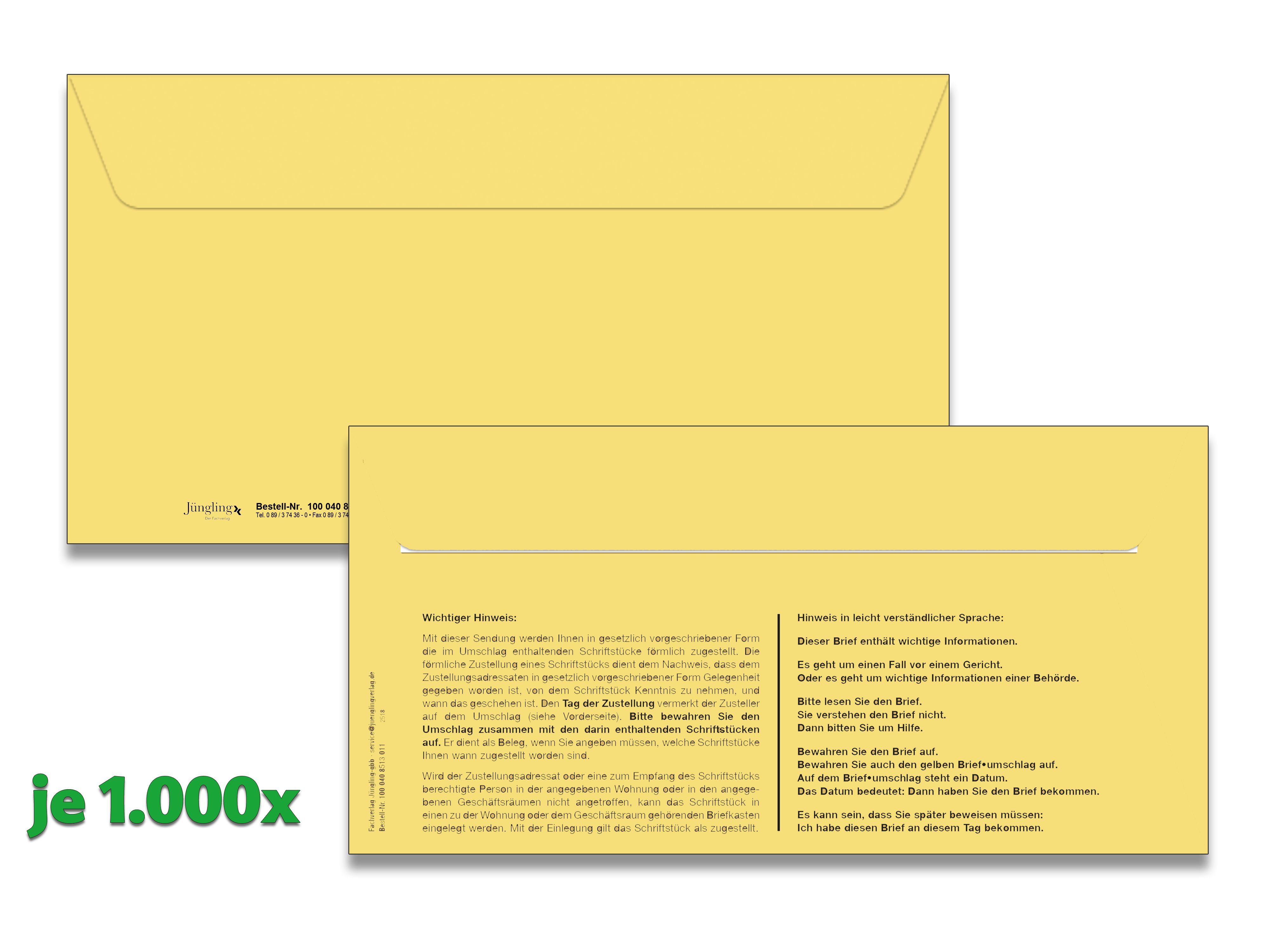 Das Zustellungs-Paket für Gerichtsvollzieher und Behörden von der Deutschen Post AG enthält je 1.000 Stück formelle Zustellungs-Umschläge ohne den Postzustellungsurkunde (PZU). Es ist ideal für förmliche Zustellungen geeignet.