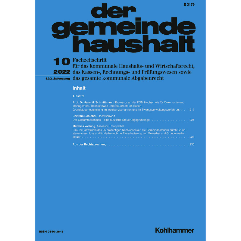 Die Zeitschrift Der Gemeindehaushalt ist die Fachzeitschrift für den Kämmerer in der Kommune. Sie ist ein Forum zur Diskussion aller Probleme des Gemeindehaushalts im weitesten Sinne, nämlich des eigentlichen Haushaltsrechts, des Kassenrechts, des Prüfungswesens, des Steuer-, Gebühren- und Beitragsrechts, aber auch der Entwicklungen der EDV im Haushaltswesen und von Randbereichen wie z.B. Versicherungsrecht.