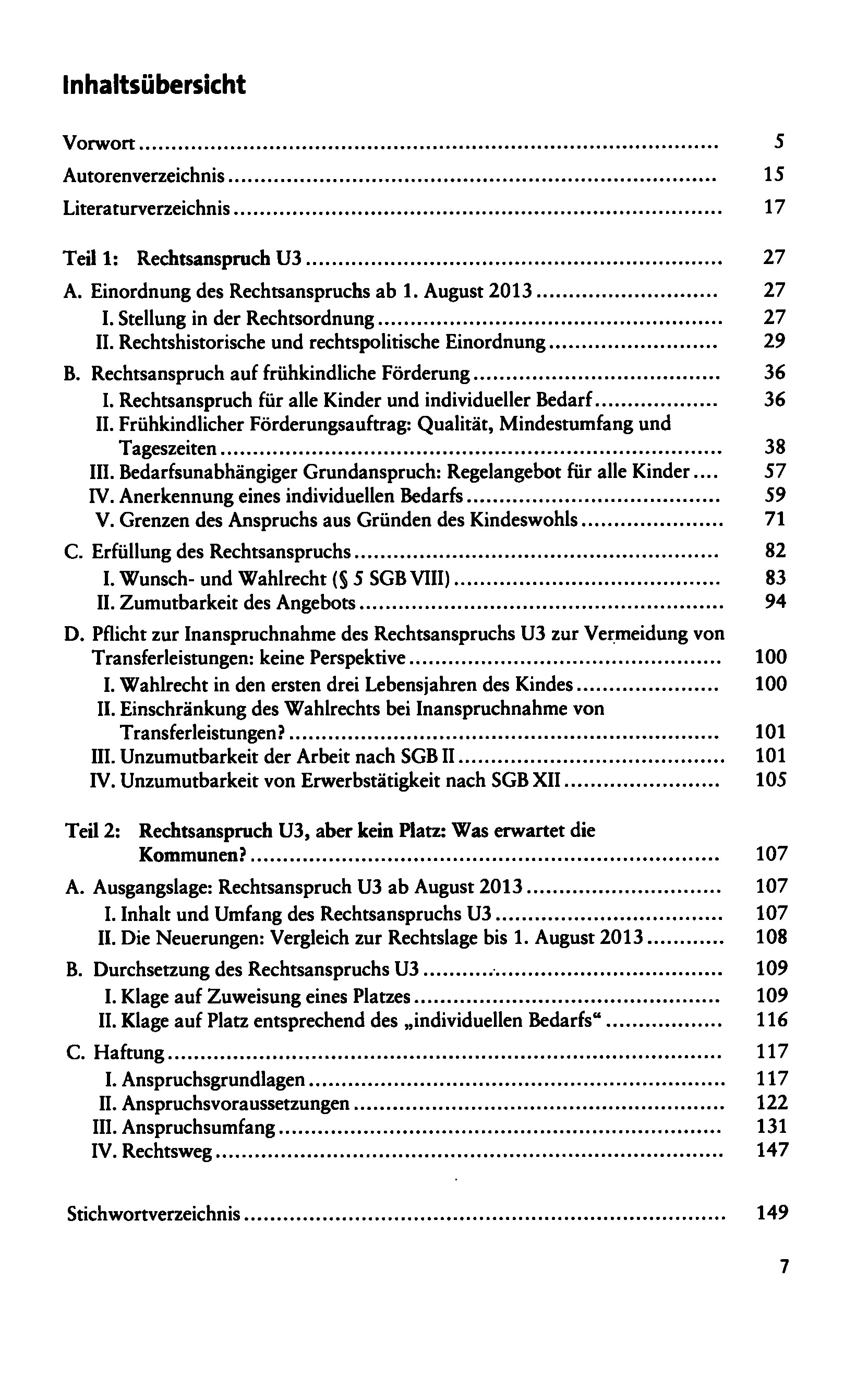 Das Buch gibt konkrete Antworten für Jugendämter, freie Träger, Kommunen sowie Eltern und ihre Kinder. Nicht nur der Inhalt des „Rechtsanspruchs U3“, sein Umfang und seine Grenzen werden umfassend und leicht zugänglich aufbereitet; auch zu Klagemöglichkeiten und Haftungsansprüchen finden Gerichte und Rechtsanwält/inn/e/n konkrete Antworten. Berücksichtigt sind hierbei auch landesrechtliche Besonderheiten.