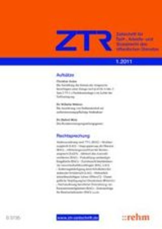 Die Zeitschrift für Tarifrecht (ZTR) ist das übergeordnete Forum für die aktuelle Diskussion tarifrechtlicher Fragen des öffentlichen Dienstes. Angrenzende Rechtsgebiete wie z.B. das Beamten-, Personalvertretungs-, Arbeits- und Sozialrecht werden berücksichtigt, soweit sich Rückwirkungen auf das tarifliche Geschehen ergeben.