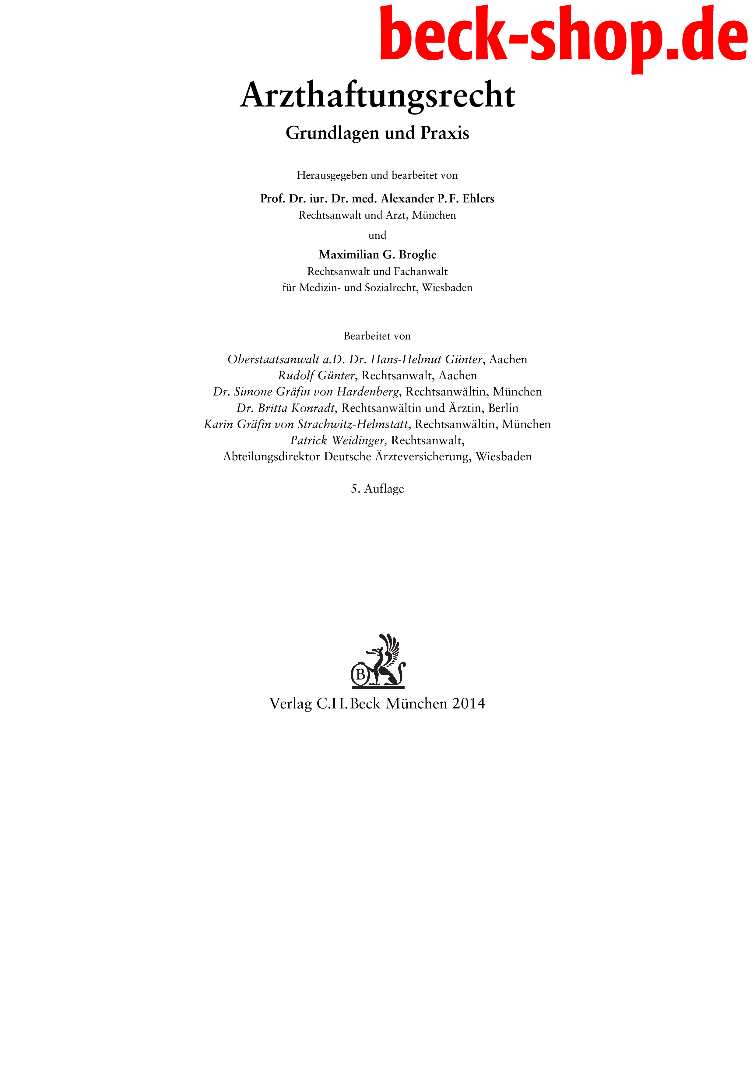 In der 5. Auflage sind insbesondere aktuelle haftungsrechtliche Rechtsprechung des BGH und der Obergerichte sowie Erkenntnisse der Gutachterkommissionen und Schlichtungsstellen berücksichtigt worden. Eingearbeitet sind darüber hinaus neue Literatur zum Haftungsrecht der Ärzte sowie aktualisierte Daten und Fakten der Haftpflichtversicherer. Das zum 1.1.2013 in Kraft getretene Patientenrechtegesetz ist eingearbeitet und berücksichtigt.