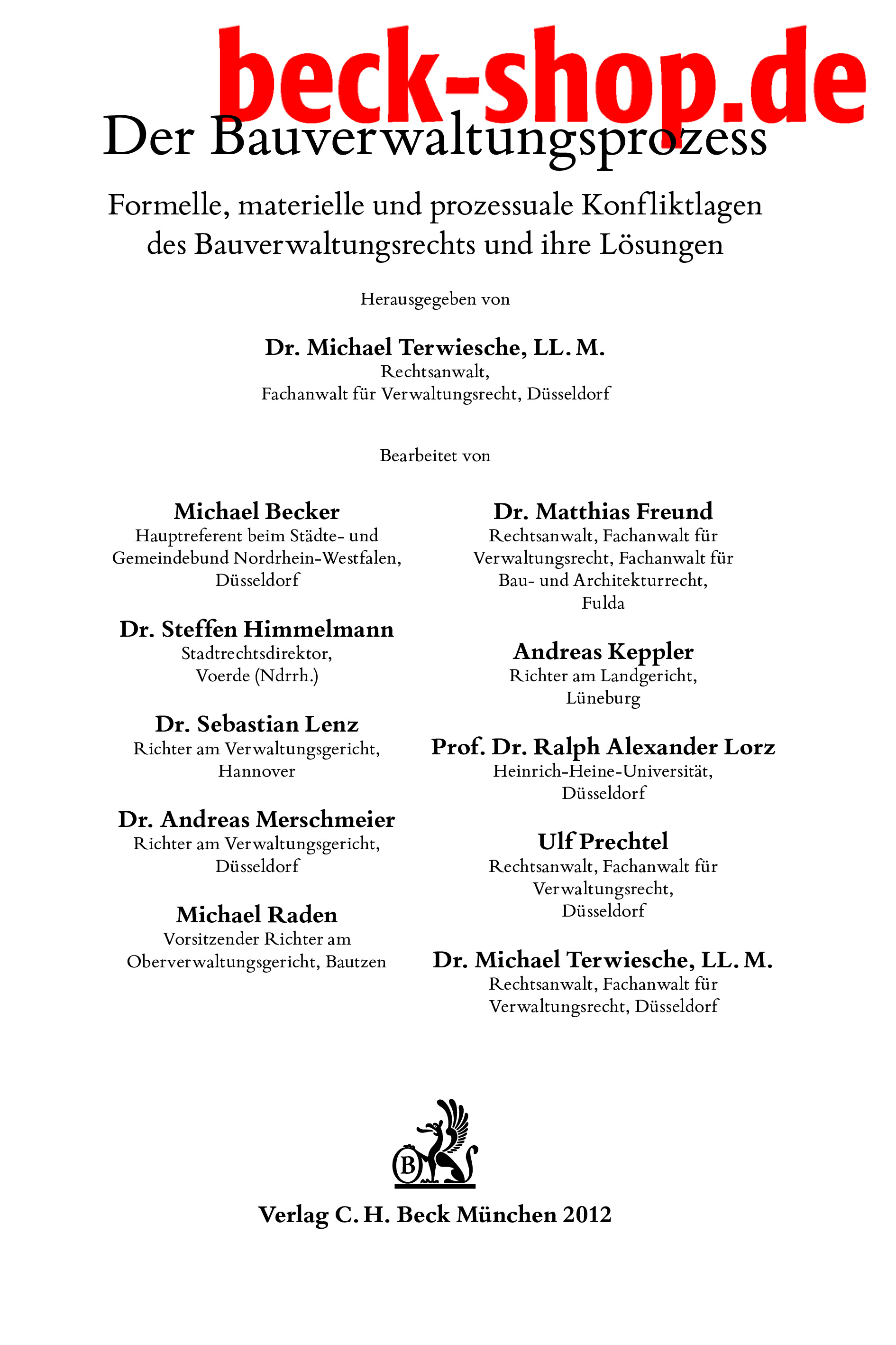 Michaael Becker, Hauptreferent beim Städte- und Gemeindebund NRW, Düsseldorf ,Dr. Matthias Freund, Rechtsanwalt, Fulda, Dr. Steffen Himmelmann, Stadtreechtsdirektor, Voerde, Stephan Keller, Beigeordneter beim Städte- und Gemeindebund NRW, Düsseldorf, Andreas Keppler, Richter am Landgericht, Dr. Sebastian Lenz, Richter am Verwaltungsgericht Hannover, Prof. Dr. Ralph Alexander Lorz, Universität Düsseldorf, Dr. Andreas Merschmeier, Richter am Verwaltungsgericht Düsseldorf, Rechtsanwalt Ulf Prechtel, Düsseldorf, Michael Raden, Vorsitzender Richter am Sächsischen Oberverwaltungsericht Bautzen, Dr. Michael Terwiesche, Rechtsanwalt, Fachanwalt für AVerwaltungsrecht, Düsseldorf