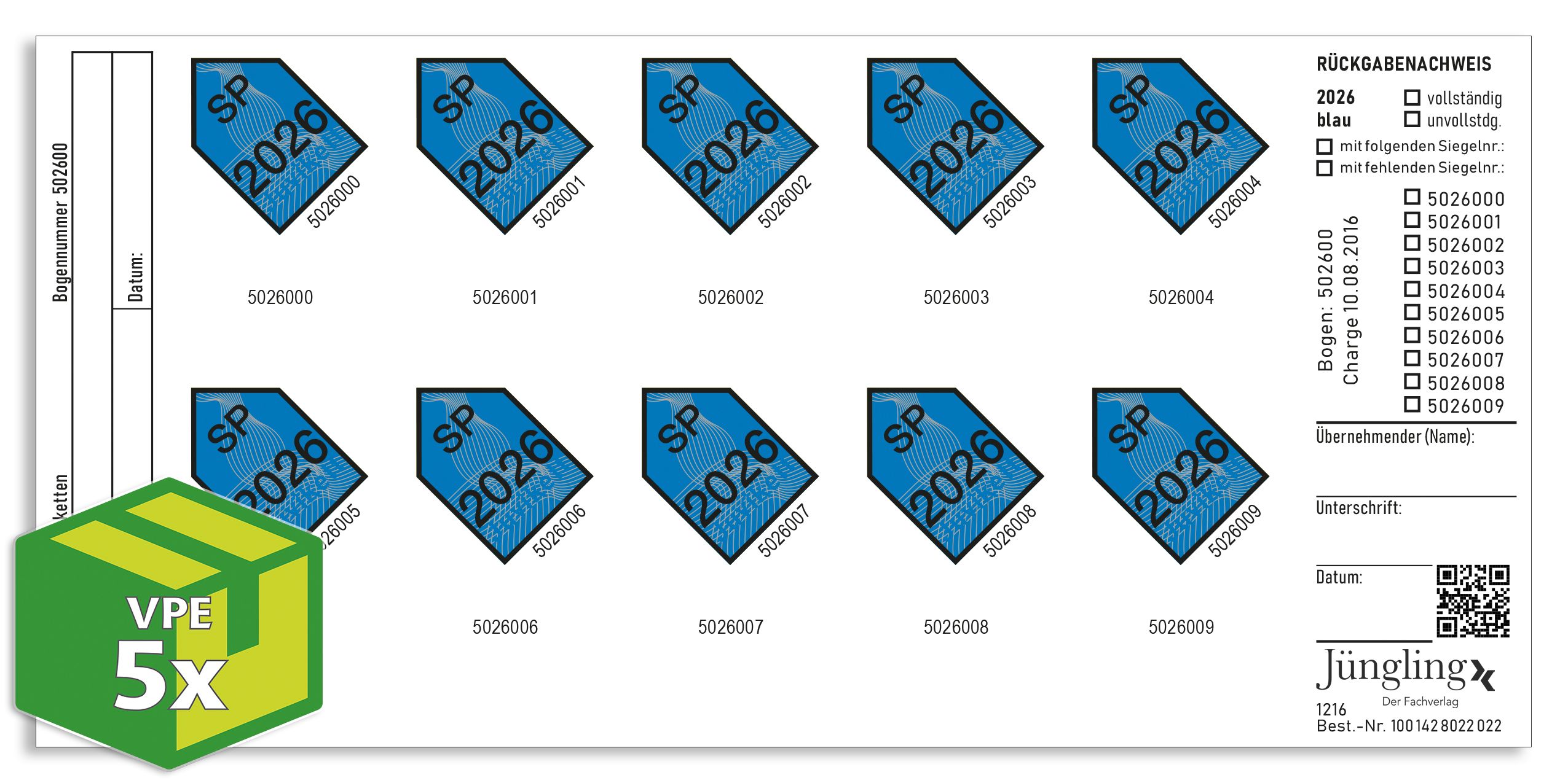 Produktinformationen "SP-Prüfmarke 2026 (blau), VKE á 50 Stück"