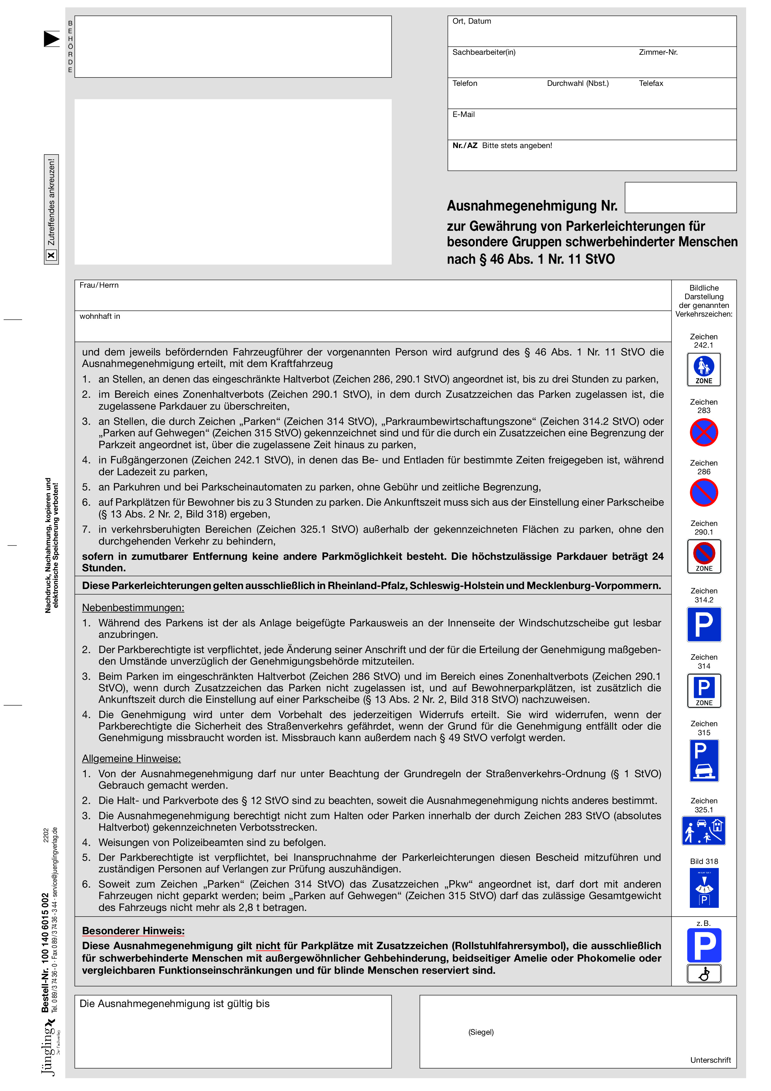 Diese Ausnahmegenehmigung richtet sich an Behörden und öffentliche Einrichtungen, die Parkerleichterungen für schwerbehinderte Menschen verwalten. Besonders geeignet für Verwaltungsstellen in Mecklenburg-Vorpommern, Rheinland-Pfalz und Schleswig-Holstein.