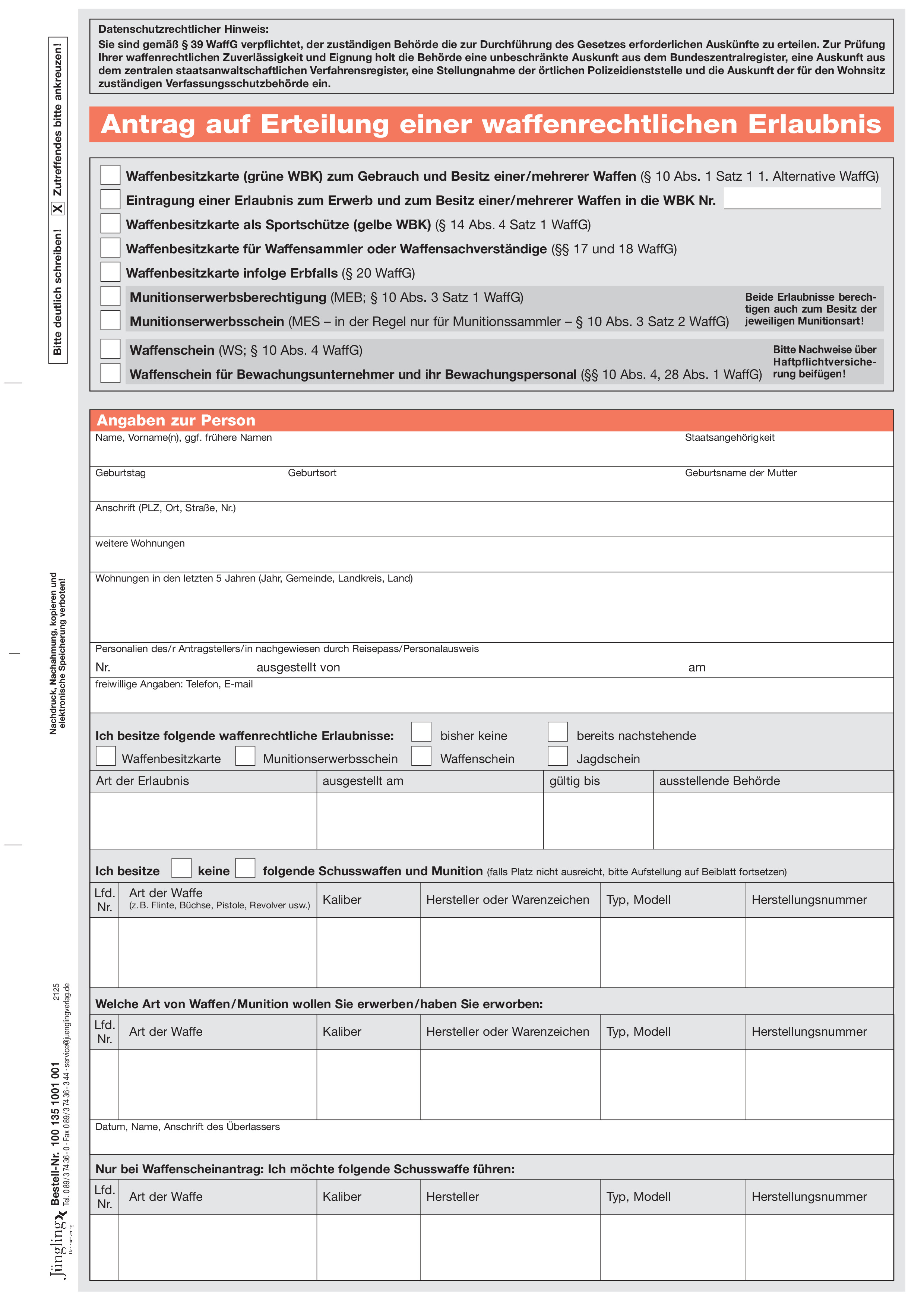 Produktinformationen "Antrag auf Erteilung einer Erlaubnis nach dem Waffengesetz, A4"