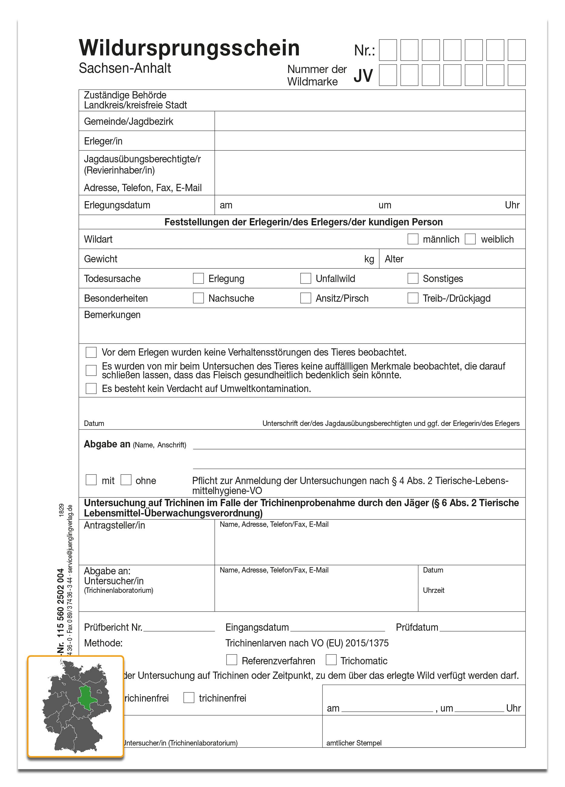 Der Wildursprungsschein ist ein Formular zur Dokumentation des Ursprungs von Wild nach den Vorgaben der Verordnung (EU) 2015/1375. Es wird in einem praktischen A5-Format angeboten und ist 4-fach SD (Selbstdurchschreibend) in den Farben weiß, gelb, grün und chamoise.